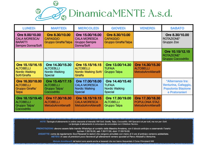 Una volta “presa la patente del Nordic Walking” sarà possibile partecipare agli allenamenti settimanali. Si ricorda che l’attività è strutturata in gruppi diversi in base al livello tecnico, la condizione fisica-motoria e l’età (e/o eventuali patologie).